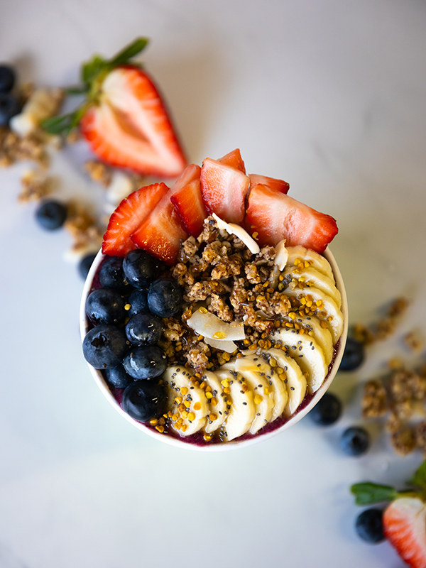 Our March smoothie of the month, named “C is for Cookie” because of its blue color and cookie flavor, is full of vital nutrients. It gets its beautiful hue from blue spirulina, which can help boost the immune system as well as reduce inflammation. It also has 10 grams of plant-based protein, cacao nibs which help support mood from the theobromine found in them, and maca powder which increases energy and adds a delicious caramel flavor. All of our smoothies, juices, and açaí bowls boast in their rich vitamin and mineral complexes, so no matter what your flavor preference is you’re still getting a slew of benefits.