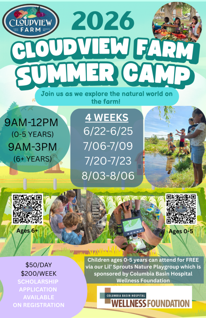 Our Summer Lil’ Sprouts program will be combined with our Summer Camps days, creating a lively, shared farm experience for our youngest visitors and their families. Lil’ Sprouts is sponsored by the Columbia Basin Hospital Wellness Foundation allowing equal access to all families in our community.